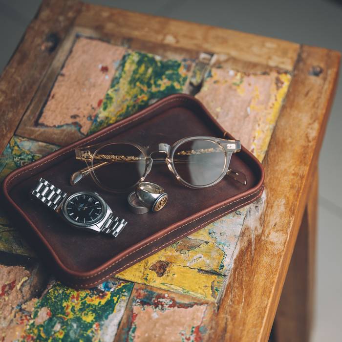 約10年間、某皮革産業で修行を積み、革の特徴を理解し本来の良さを引き出すブランド"FEELZE"と"aruci"の初コラボ。 「メガネや腕時計を置いたり、マネートレーとしてお使いいただけるサイズのオールレザートレー。素材の良さを最大限に活かし、芯材を使うことなく製作するために、鞄を作る際に用いられる”捨てマチ技法”を使用し、シンプルな製品だからこそ、素材の良さを堪能できる仕様にしました。茶芯ヌメ革はオイルをしっかり含んでおり、小物を置いたり、上に置いてある物を取ったりなど些細なことでも変化し、エイジング(経年変化)を楽しめる製品になっています。 店舗はもちろん、オフィスやご自宅など、使う場所を限らず長い期間ご愛用していただけます。」