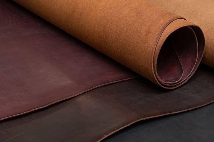 革の表面のみを染色し、革の断面や床面(裏)が表とは異なる色をしているのが特徴。