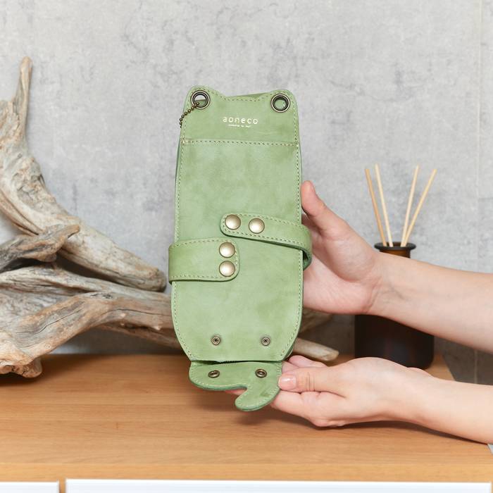 フラップの形、そこへのネコの型抜き、ネコのチャーム、そして背面にも隠れネコ要素。かわいすぎずさりげないネコ要素なので、年齢性別問わずお使いいただけます。背面にはポケットもあり、スマホやメモ帳などを収納できます。