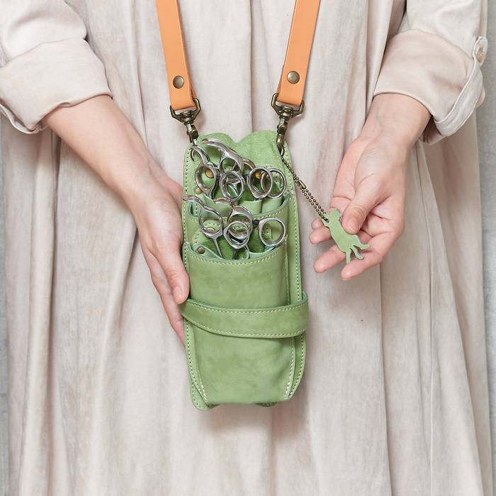 スリムシザーの大きな特徴は、まずフラップがあること。何店舗もかけもちされる方や動物に刃物があたらないようトリマーさんにもおすすめです。そしてポケット、ダッカールベルト、ショルダー、フラップと、全てのパーツがバラバラになります。お手入れに便利な仕様になっています。背面のホックを外すと底も大きく開き、中にたまった髪の毛を取り出しやすい仕様になっています。