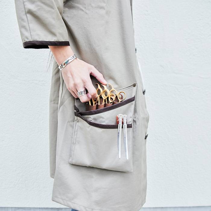 そのまま着ていただくのはもちろんのこと、シザーポケットを付けることもできます。コートのポケットの中にシザーポケットを付けると一枚羽織るだけで仕事着になります。 シザーポケットはホックで付けるため、取り外しも簡単。aruciのシザーポケットを既にお持ちの方は、ホックを付けてお届けします。そうすることで、付け替えてお使いいただけます。