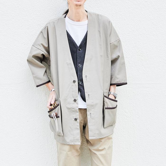 全ての職人へ捧ぐ、ハイエンドなジャケットを仕立てました。服を水やカラー剤、ブリーチなどの汚れから服を守り、一枚さっと羽織るだけでコーディネートも決まります。性別年齢問わず着ていただける、ユニセックスのワンサイズになっています。大きく開いた襟元がすっきりとした印象になり、きっちりとしたフォーマルにもカジュアルにもコーディネートしていただけるデザインになっています。