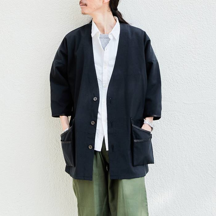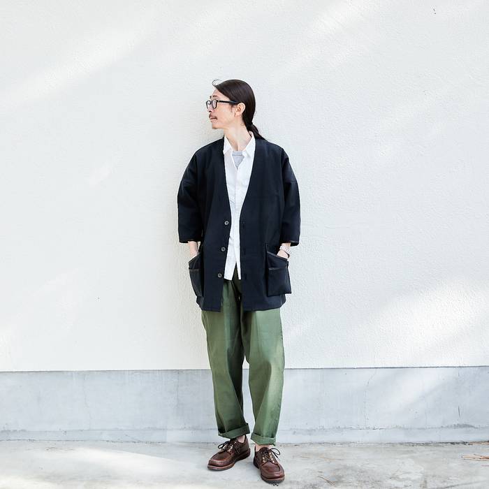 全ての職人へ捧ぐ、ハイエンドなジャケットを仕立てました。服を水やカラー剤、ブリーチなどの汚れから服を守り、一枚さっと羽織るだけでコーディネートも決まります。性別年齢問わず着ていただける、ユニセックスのワンサイズになっています。大きく開いた襟元がすっきりとした印象になり、きっちりとしたフォーマルにもカジュアルにもコーディネートしていただけるデザインになっています。