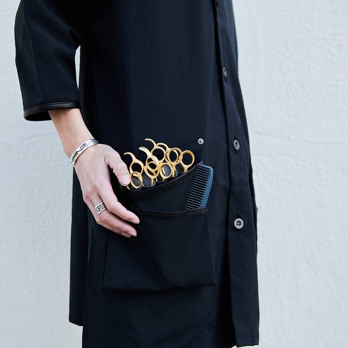 ポケットの仕様だけでも何度も試作を繰り返し、この形に行きつきました。わざとポケットの下を本体に縫い止めず、浮かせ状態にしています。【ポケットの中を掃除しやすい】内側をくるっとひっくり返しやすいため、ポケットの中にたまった髪の毛などが簡単に取り出せます。【座った時に体に沿うことにより、使いやすい位置にくる】座ってカットする際に、引っかかったり動きづらくならないようになっています。
