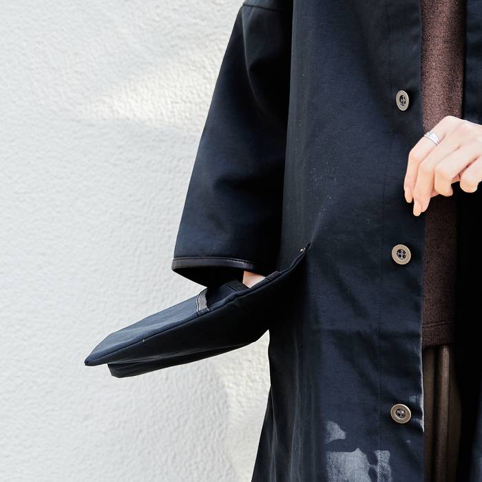 そのまま着ていただくのはもちろんのこと、シザーポケットを付けることもできます。コートのポケットの中にシザーポケットを付けると一枚羽織るだけで仕事着になります。 シザーポケットはホックで付けるため、取り外しも簡単。aruciのシザーポケットを既にお持ちの方は、ホックを付けてお届けします。そうすることで、付け替えてお使いいただけます。
