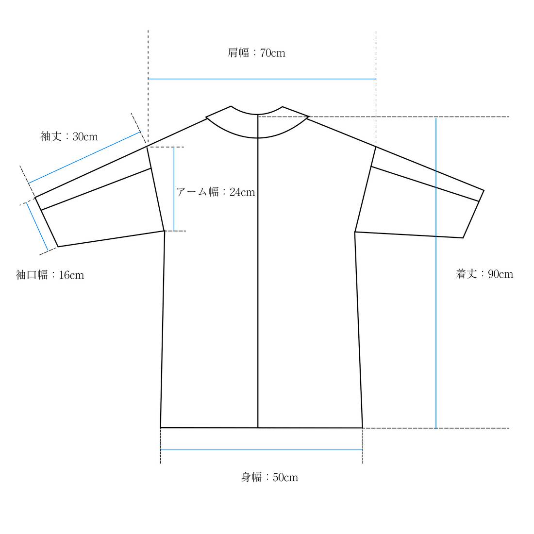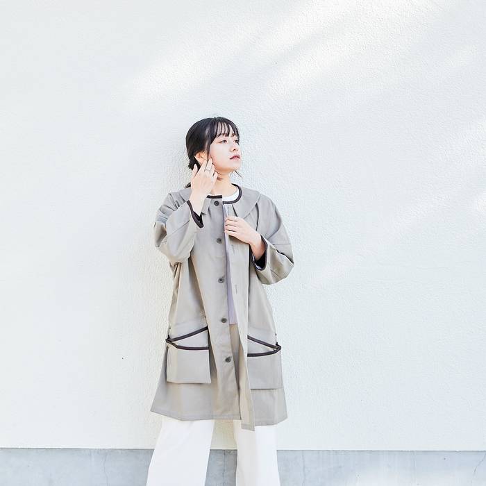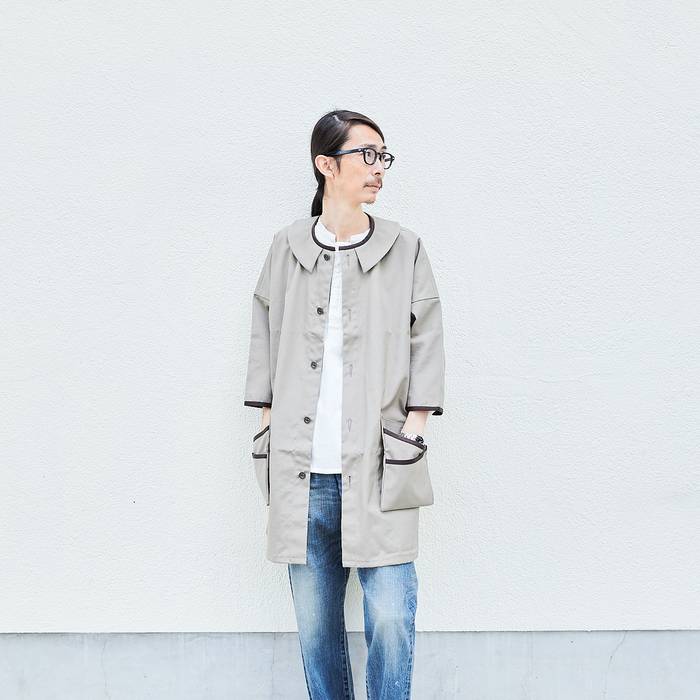 アンティークな英国ワークコートから着想を得た丸襟デザインのコートで、コンセプトベースは「モダンとレトロが調和する作務衣」です。仕事のじゃまにならない七分袖になっており、全ての職人へ捧ぐ、ハイエンドなコートを仕立てました。服を水やカラー剤、ブリーチなどの汚れから服を守り、一枚さっと羽織るだけでコーディネートも決まります。性別年齢問わず着ていただける、ユニセックスのワンサイズになっています。