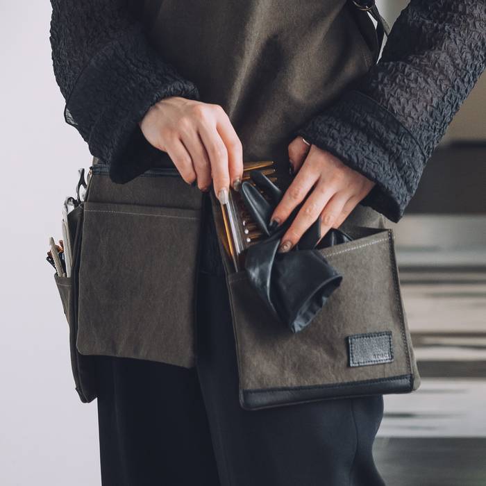 左右、中央に合計5点のポケットがあり、収納に便利。利き手に合わせてシザーポケットを付けることもできます。