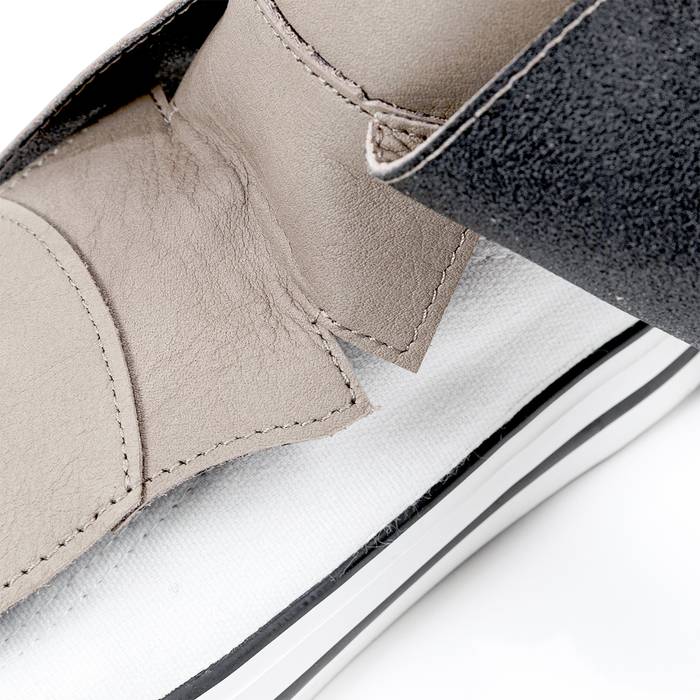 カラー剤やブリーチ、シャンプー時などの水などを扱うことを考慮し、革メーカーと共同開発した特別なオリジナルレザーを使用しています。革を加工する段階で3Mスコッチガードの防水加工を施すことにより、半永久的に防水効果が持続します。そのため、カラー剤やブリーチによる靴への汚れを気にすることなくお仕事していただけます。付着してから時間が経過すると色が染み込みシミになる場合があります。また革の質感もお楽しみいただけるよう、マットな表情に仕立てているそのため高級感のある風合いになっています。革を使っていますが重さは片足わずか77gです。※使用している場所により革にシワが入っている場合がありますが、こちらは天然素材によるものなので、品質に問題はございません。