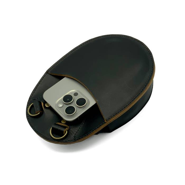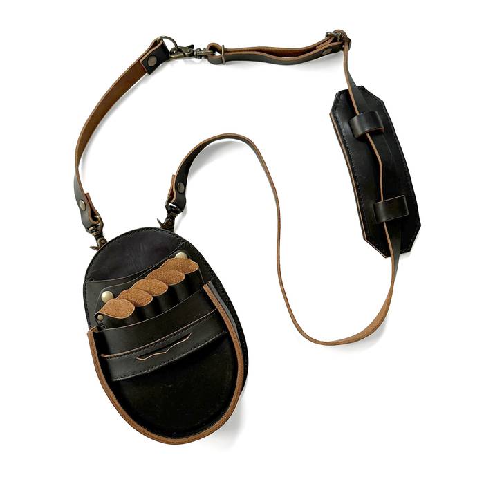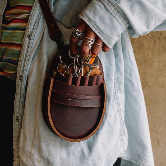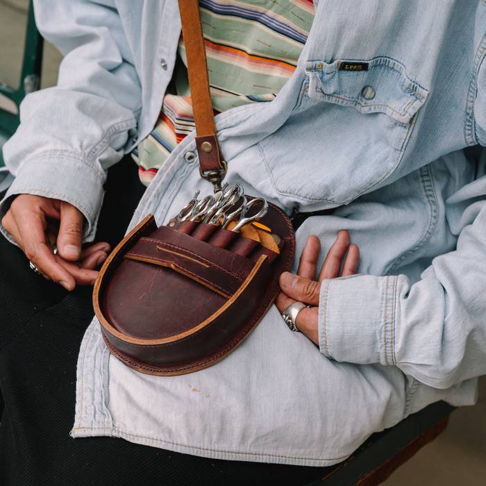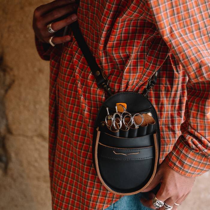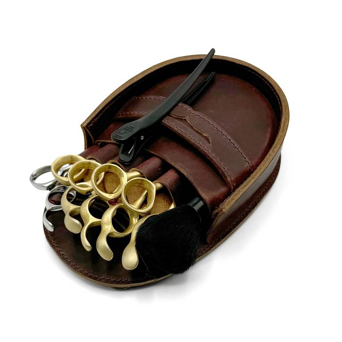 ローファーを元にデザインしながら実用性も兼ね備えています。 シザーが5丁まで収納可能。ボディ前面にはローファーのサドルをモチーフにしたダッカールベルトを付けました。コーム用の仕切りなど、デザインを崩すことなく、道具を綺麗に収納する機能が組み込まれています。 シザーポケットは取り外せるため、中に入った髪の毛なども掃除しやすくなっています。