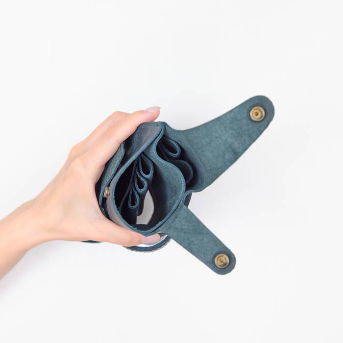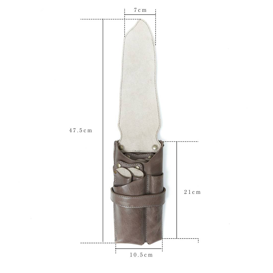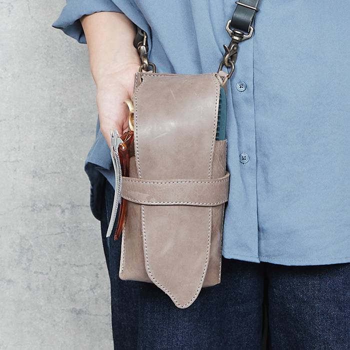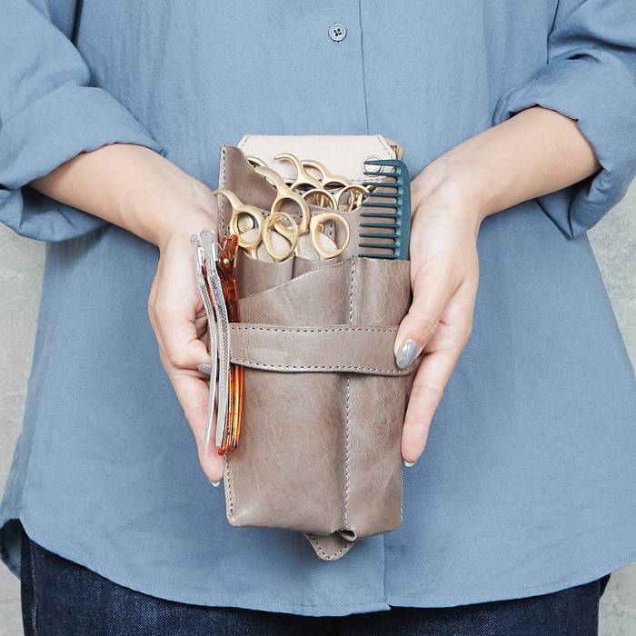 シザーを5丁収納できるポケットとは別に、コームなど道具を別に入れていただける単独ポケットがあります。大きく開いた三角形の切り込みの間口が名前の由来です。シザーポケットは3丁用と2丁用が2段になった、5丁タイプです。ブラシを装着できるサイドループと、お掃除に便利な背面フラップ付き。スリムシリーズの大事なポイントは、お手入れのしやすさです。パーツが全てバラバラになり、背面のホックを外すと中にたまった髪の毛なども取り出しやすい仕様になっています。フタ付きなので持ち運びの多い方、シザーが動物にあたらないようトリマーの方へもオススメです。使うほどに艶が出てどんどん経年変化するのも、大きな特徴です。