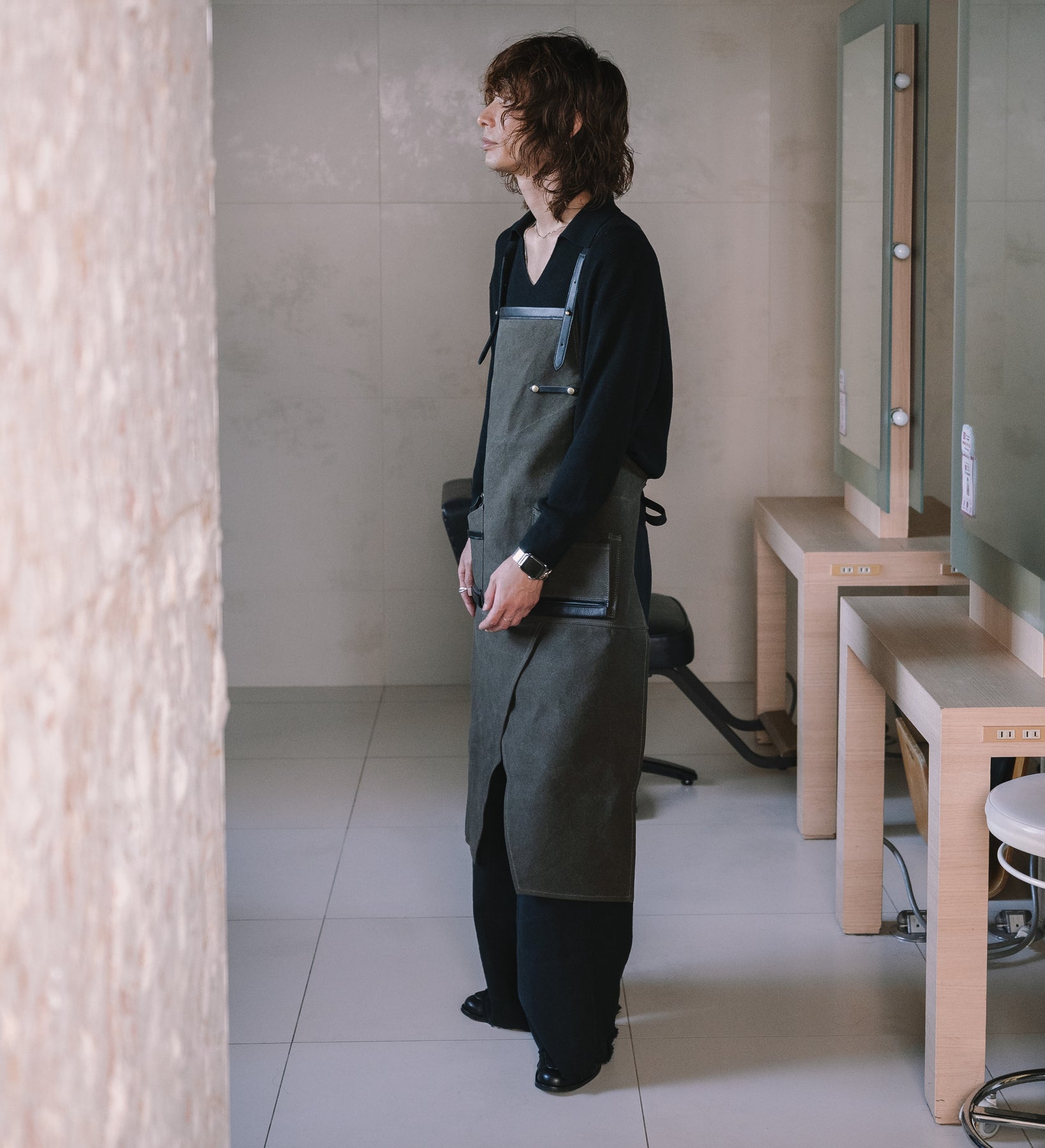 身体をしっかりと覆えるため、衣類への汚れの付着を防ぎ、動きの多い施術や作業でも安心して着用できるエプロン。 横幅60cm、着丈が100cmと通常のエプロンに比べて一回り大きくなり、幅広エプロンならではの安心感と、毎日の仕事を支える高い実用性を兼ね備えています。