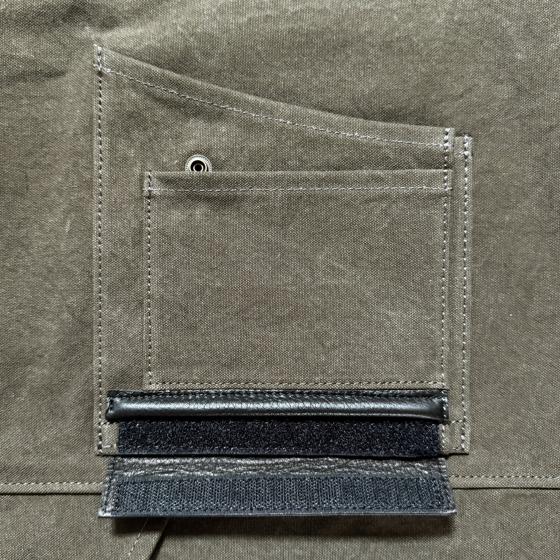 10号帆布にバイオウォッシュ加工とパラフィン加工をした希少な生地です。機能美と造形美を兼ね備えたヴィンテージな風合いをお楽しみください。