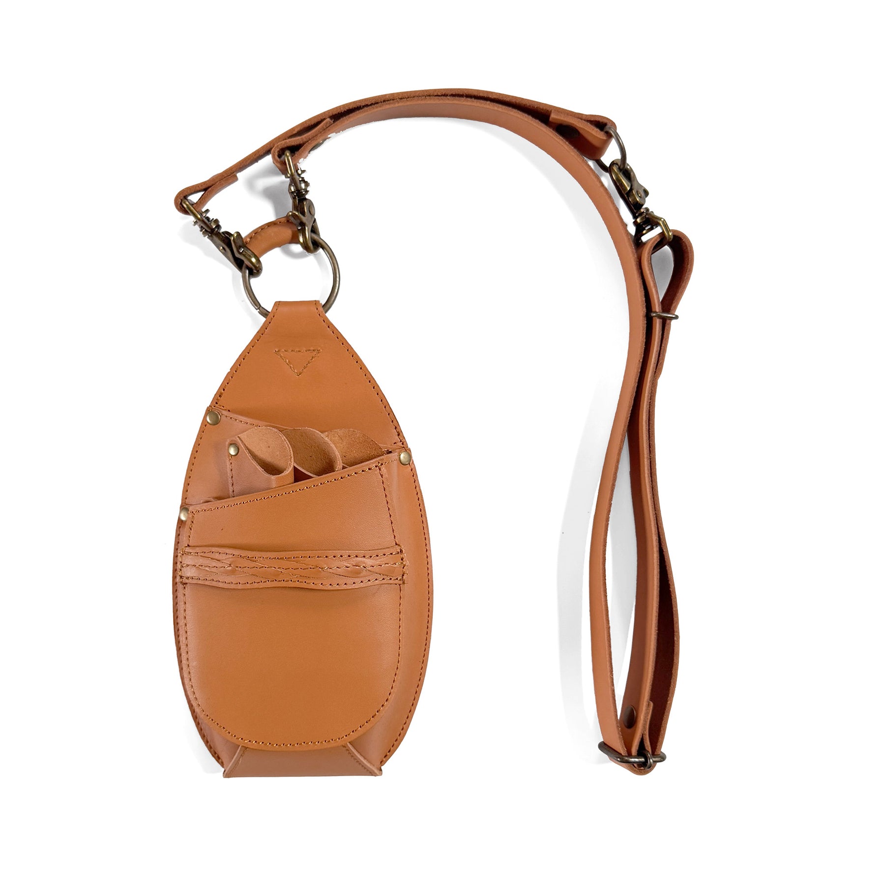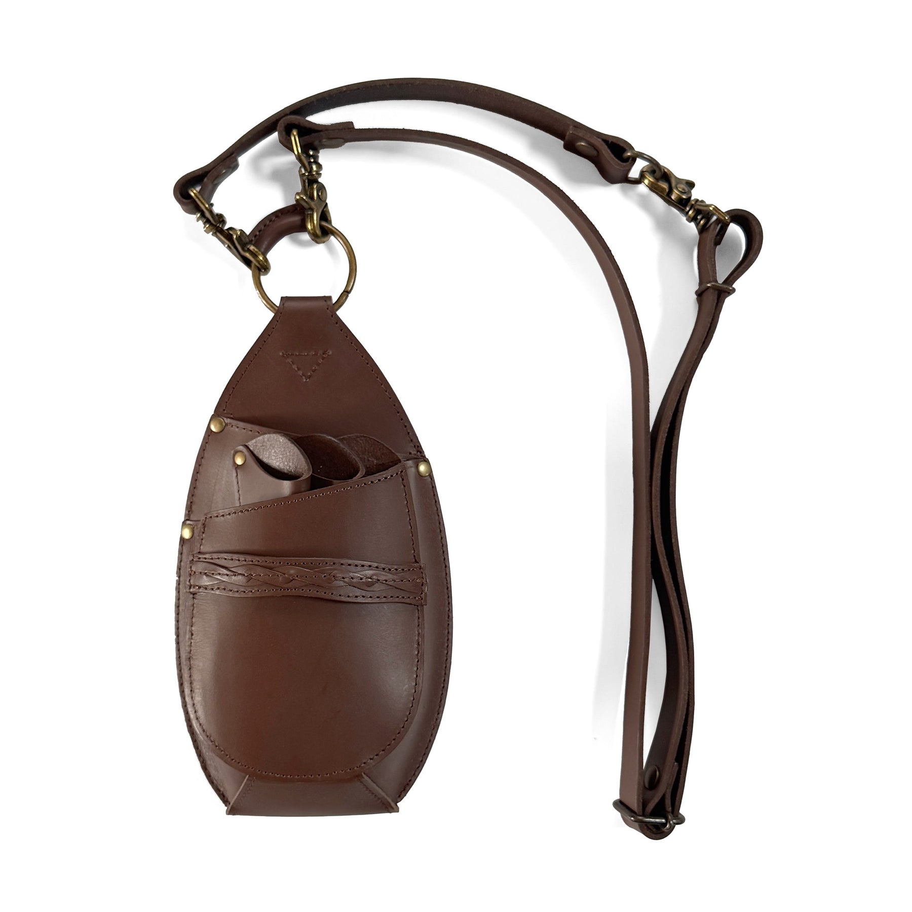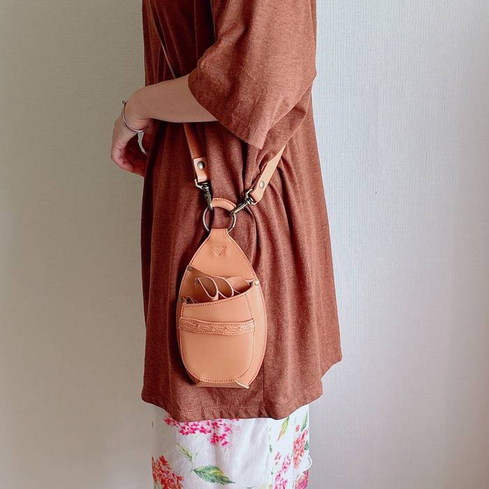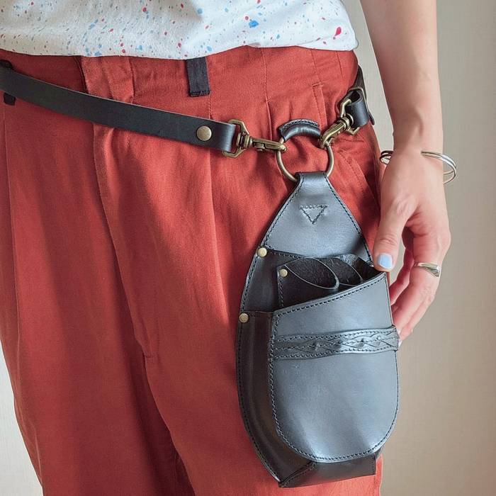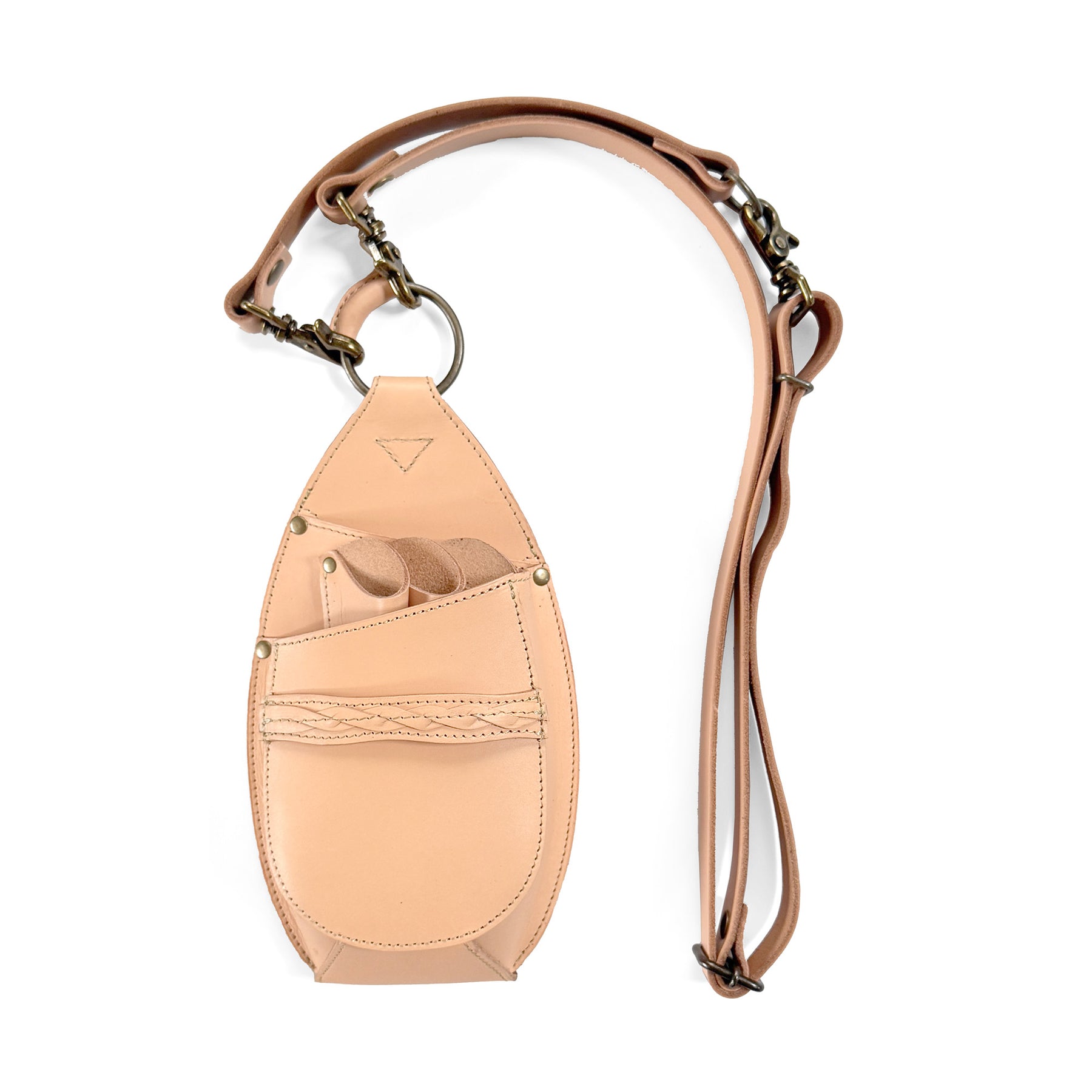 硬い印象を与えるホックや金具パーツには革で包み温かみのある優しい印象に仕上げました。 背面の特徴的なリングは革で包むことでショルダーの取り付け位置が左右に振り分け、着用した際にバランスや安定感、体へのフィット感を高めて自然な着け心地に。 前面のダッカールベルトは、ツタをイメージしており、波打つラインは使い込んでも角の摩耗や擦れが目立ちにくい上品なデザインです。 また、コーム用のポケットやダッカールベルトなど必要な道具を綺麗に収納することもできます。