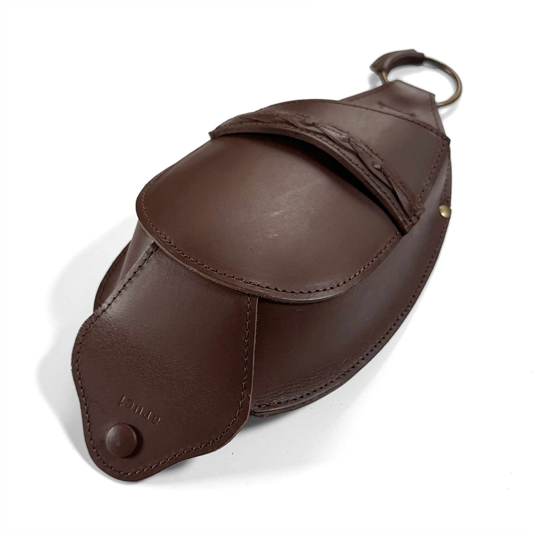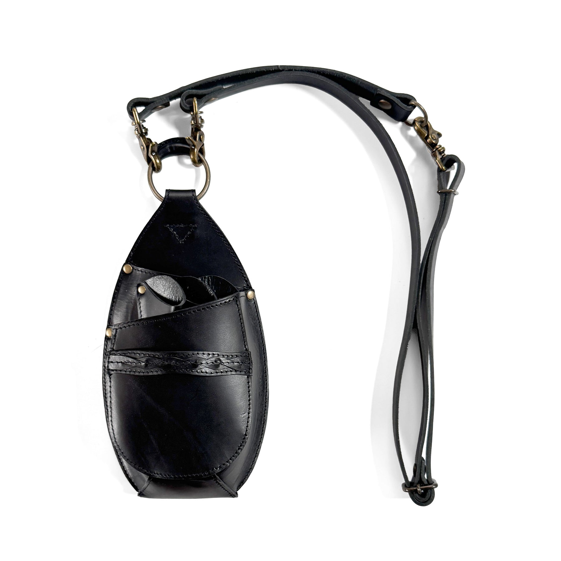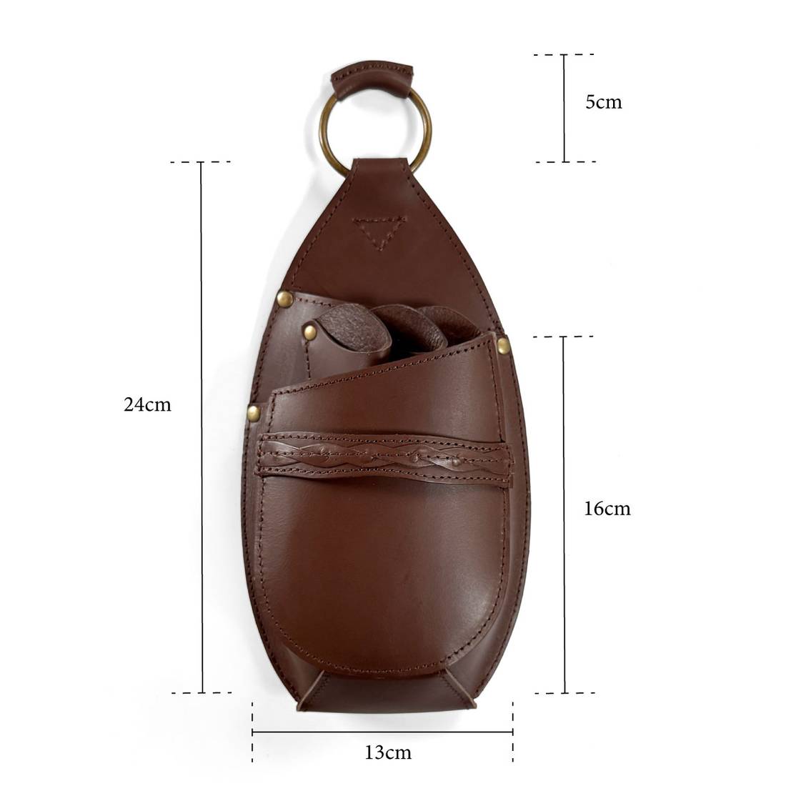 硬い印象を与えるホックや金具パーツには革で包み温かみのある優しい印象に仕上げました。 背面の特徴的なリングは革で包むことでショルダーの取り付け位置が左右に振り分け、着用した際にバランスや安定感、体へのフィット感を高めて自然な着け心地に。 前面のダッカールベルトは、ツタをイメージしており、波打つラインは使い込んでも角の摩耗や擦れが目立ちにくい上品なデザインです。 また、コーム用のポケットやダッカールベルトなど必要な道具を綺麗に収納することもできます。